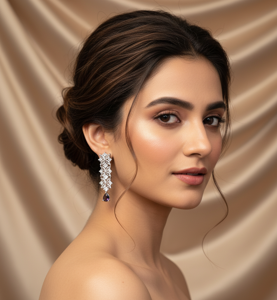 Rich Purple Focal Point: The earring is completed by a single, prominent teardrop-shaped gemstone in a deep, vibrant amethyst or dark purple color. This colored drop provides a beautiful contrast to the clear stones.
