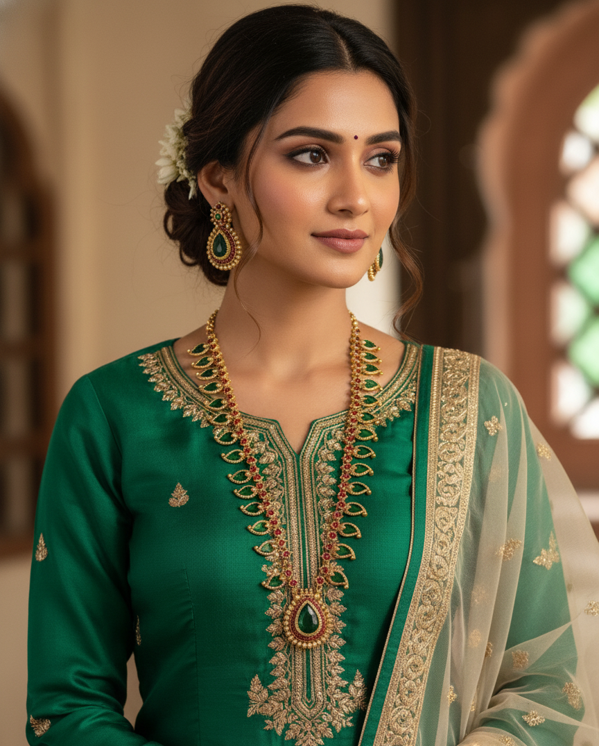 Complete Bridal/Festive Set: The piece is paired with simple, matching stud earrings that mirror the green and red stone elements of the necklace, making it a complete set suitable for weddings, festivals, and classical dance performances.